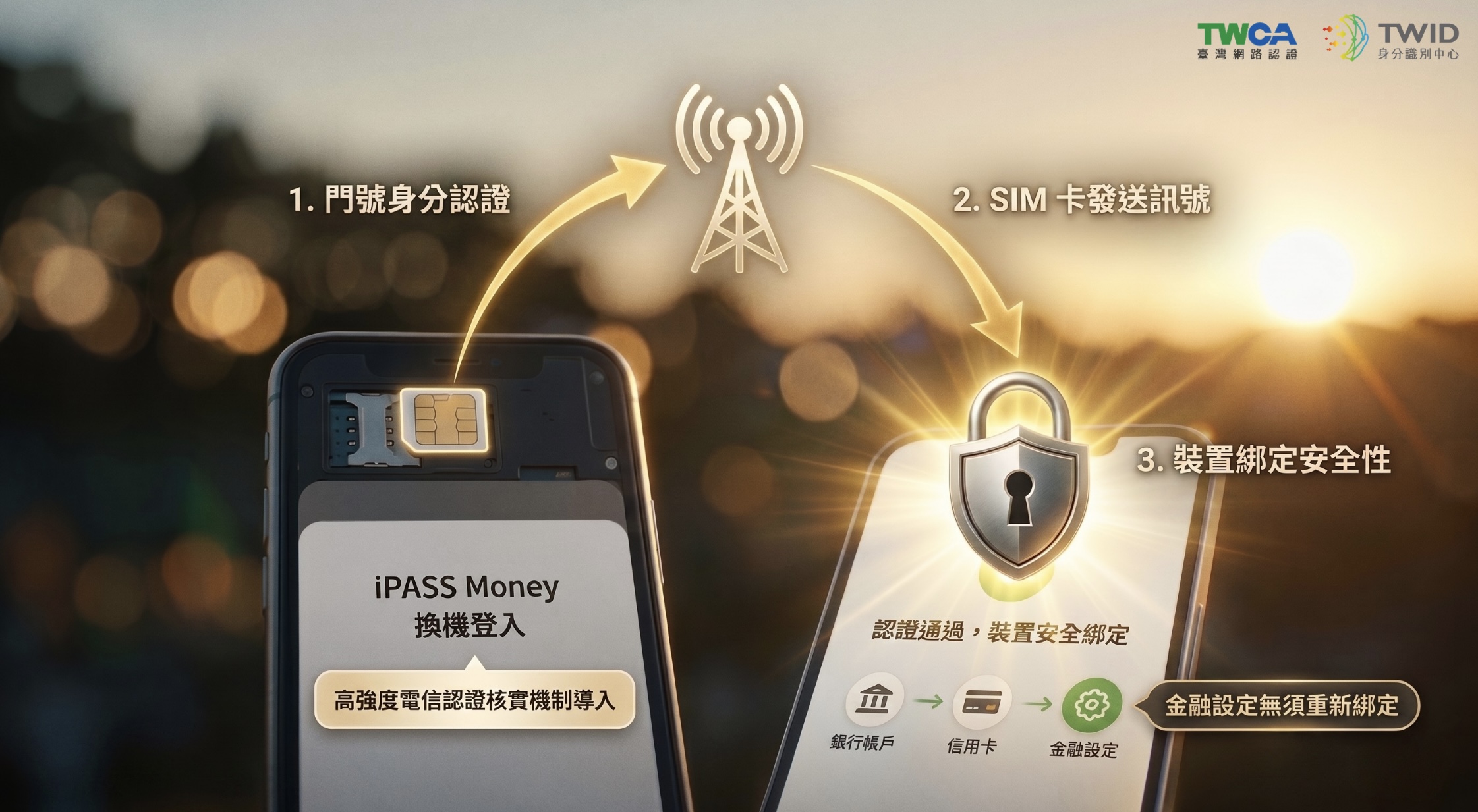 臺網公司發言人周副總表示,此次iPASS MONEY為了提升對於更換裝置登入用戶的資安保護,導入臺網公司旗下TWID身分識別中心行動身分識別服務高強度電信認證核實機制,未來iPASS MONEY用戶更換裝置登入時,原SIM卡換至新裝置上,透過SIM卡向電信業者基地台發送身分核驗訊號,驗證通過後,用戶即可無痛更換,銀行帳戶與信用卡自動延續金融設定,無須重新綁定。在兼顧便利與資訊安全前提下,大幅縮短換機後的用戶設定時間,同時也達到源頭阻絕詐騙的風險。發言人周副總進一步分享TWID身分識別中心高強度「電信認證」機制兩大核心技術: